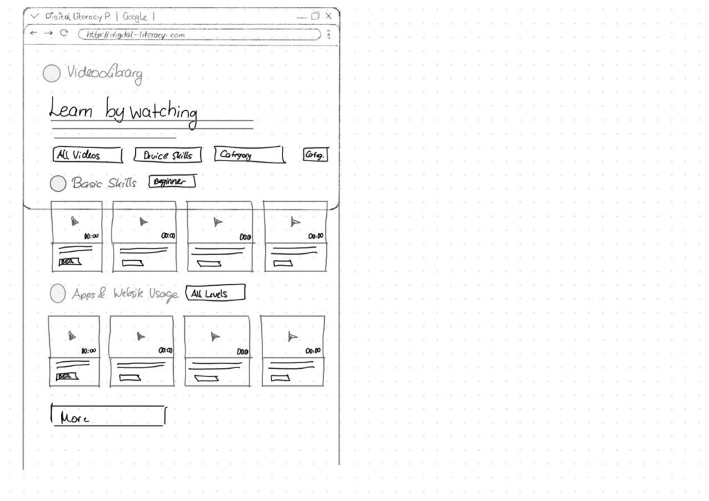 I focused on brainstorming what the digital learning platform should actually teach and how it should support older adults in learning digital skills. Instead of starting directly with the design, I tried to map out the most important areas of digital literacy that the platform could cover. These include basic device skills such as navigating smartphones or adjusting settings, understanding common apps and websites, learning fundamental digital concepts like cloud storage or files, as well as topics related to online security, communication and everyday digital tasks.