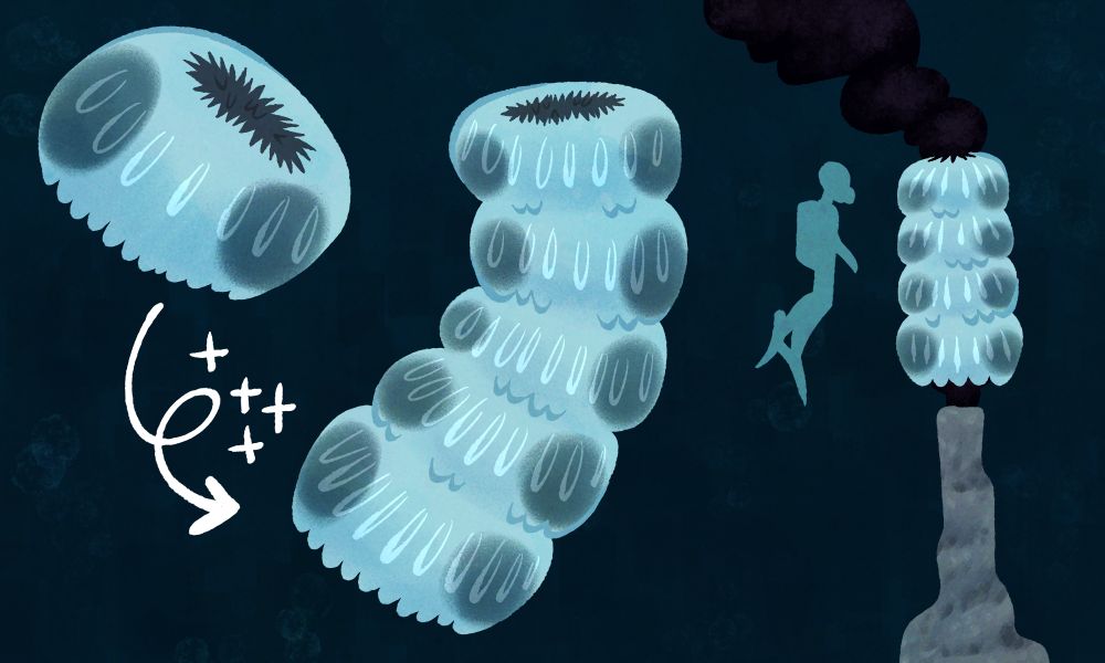 Glass Towers (Anulusnatans turrisvitrea) live in shallower oceans and grow only to a diameter of around 40cm. While they lack the funnel structure of their deep-sea cousins, they found a different way to maximize food intake: they “fuse” together with other members of their species, building large, tower-like structures that allow them to feed thoroughly and deter predators due to their unwieldy size.
