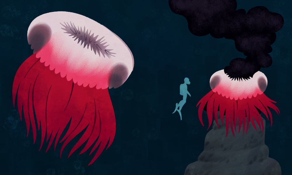 Floaters make up the subphylum of Vitrummarinum a group of animals comparable to jellyfish on Earth. They can be found in the waters right above the vents, drifting in and out of the plumes of smoke being expelled. They possess almost no sensory organs, neither do they have a brain – only a rudimentary sensory system that allows them to detect light, temperature and vibrations in the water. The opening in the centre of their body is filled with soft bristled that they use for filter feeding, which is usually done by “sitting” atop active vents.