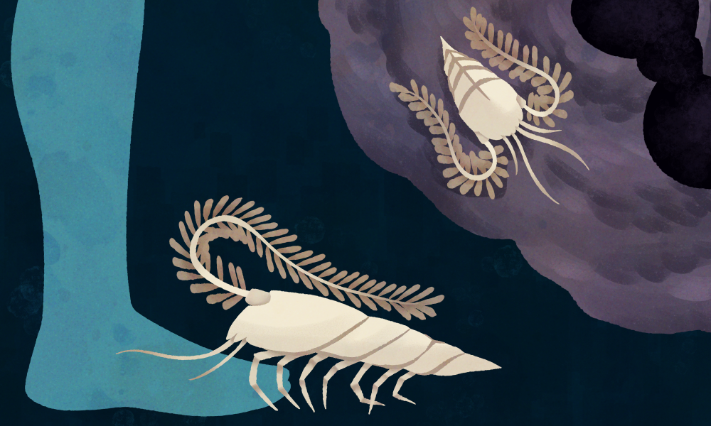 The White Bristle Crab is one of the most common representatives of the Armaturatus phylum, which are defined through the segmented shell protecting their bodies, similar to a knight’s armor. They live directly on the vents, roving around in large groups. Their long-bristled antennae are home to bacteria, which go through a process called chemosynthesis that detoxifies the poisonous minerals from the water and turn them into organic matter (–> see Chemoplankton). By “cleaning” their antennae the White Bristle Crabs are able to harvest this organic matter. They lack any kind of image-forming organ, though they are extremely sensitive to vibration.