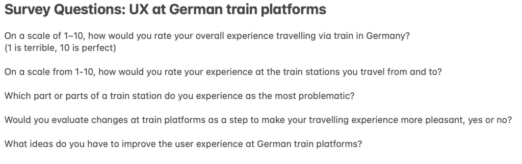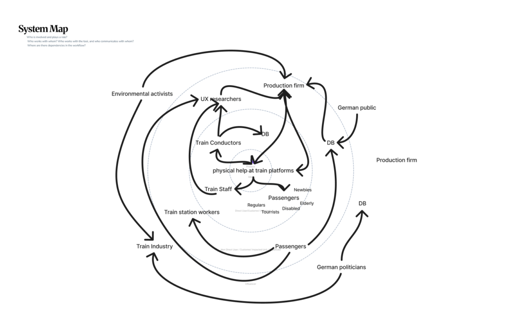 The first of those approaches is system mapping. It is used within design research to visualize relationships between actors, infrastructures, and external influences. Rather than focusing on single touchpoints, system maps enable designers to identify interdependencies, power structures, and flows of information, and uncover opportunities for more systemic and sustainable interventions (zero360., 2026). In this project, system mapping serves as the starting point for investigating the experience of German train platforms. These environments are characterized by high density, time pressure, and diverse user groups, making them inherently complex.