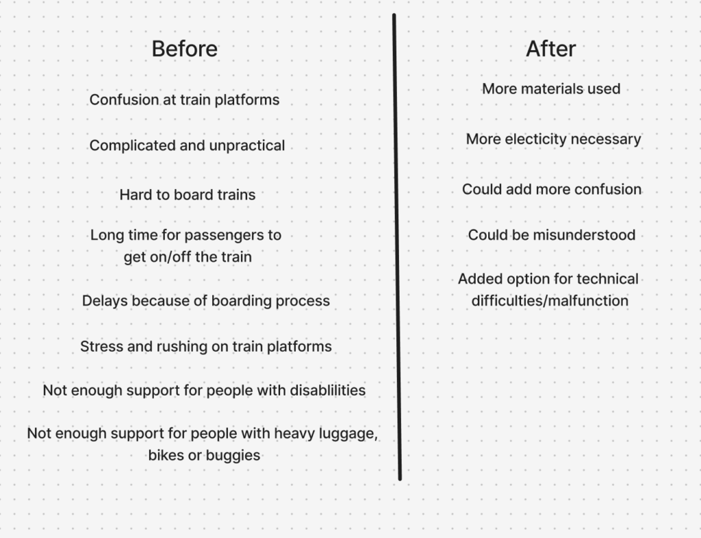 To address this, a Change and Impact map was developed. Building directly on the system map, it introduces a temporal dimension by comparing the current state (“Before”) with a projected future scenario (“After”). The “Before” perspective synthesizes the key issues identified in the system analysis, including disorientation, overcrowding, inefficient boarding processes, and limited accessibility. These challenges are not isolated but interconnected, reinforcing one another and contributing to an overall stressful experience (Mural, 2025).