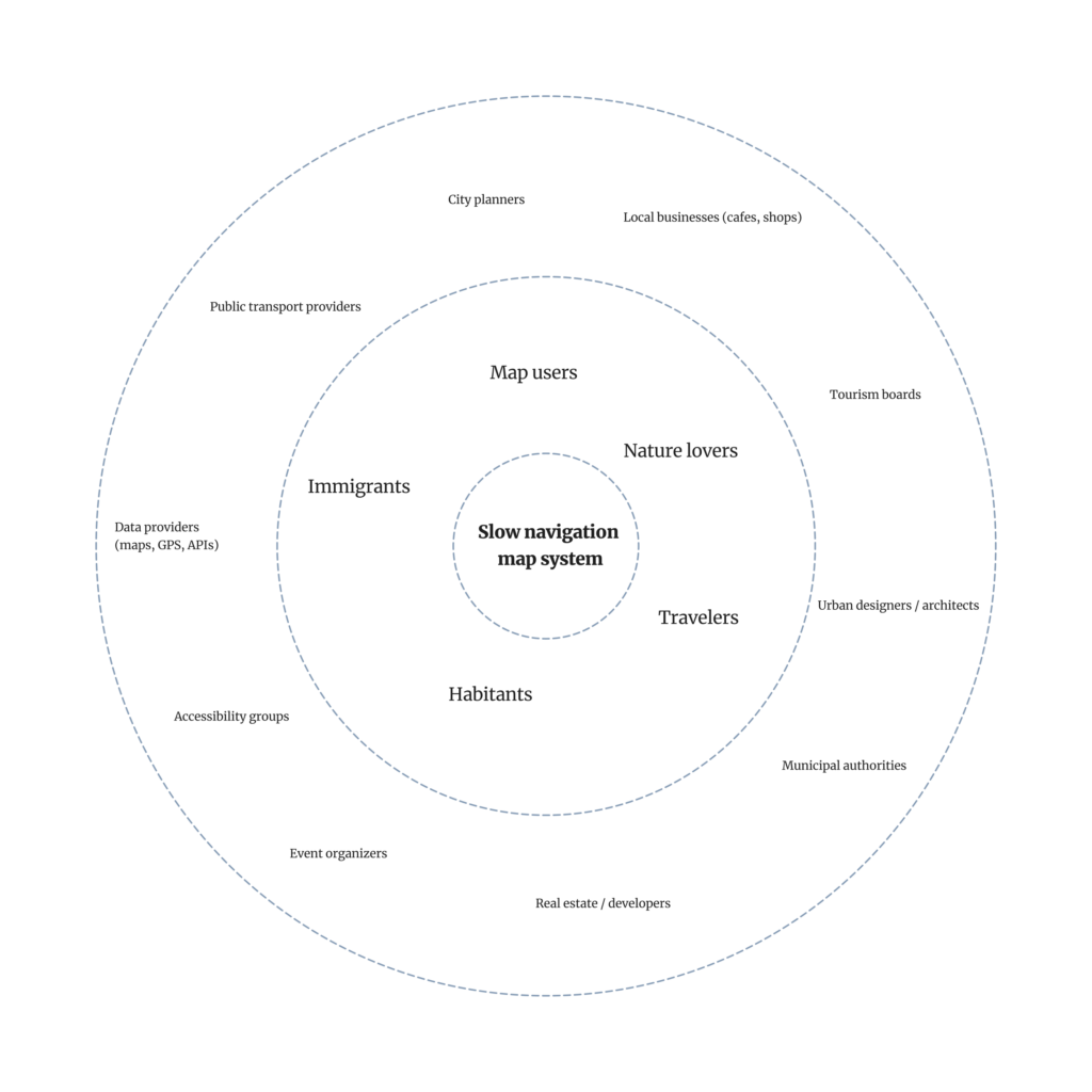 Here, the navigation system encourages users to explore unfamiliar parts of the city.