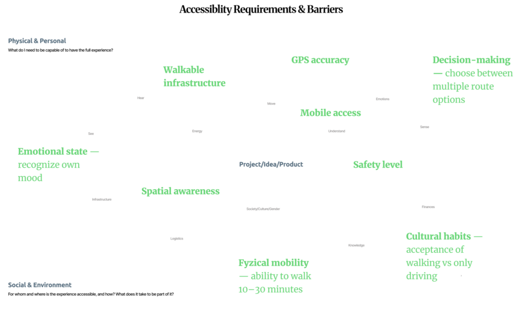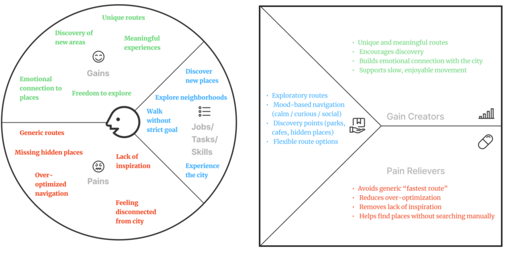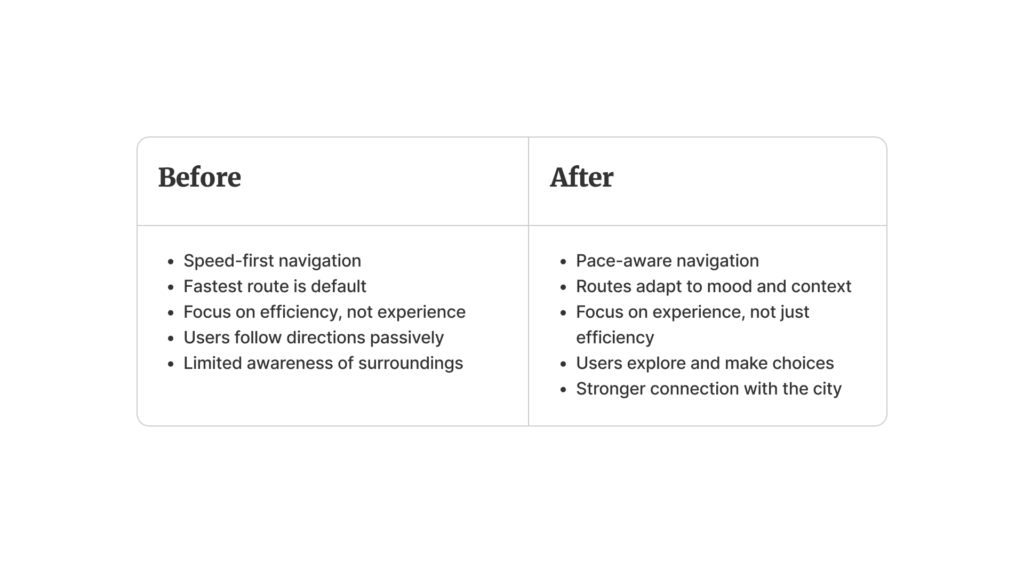 In this scenario, the user first selects their mood or intention (calm, curious, social, fast), and then receives a route that matches that mood.