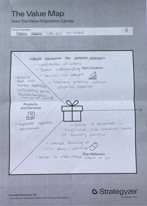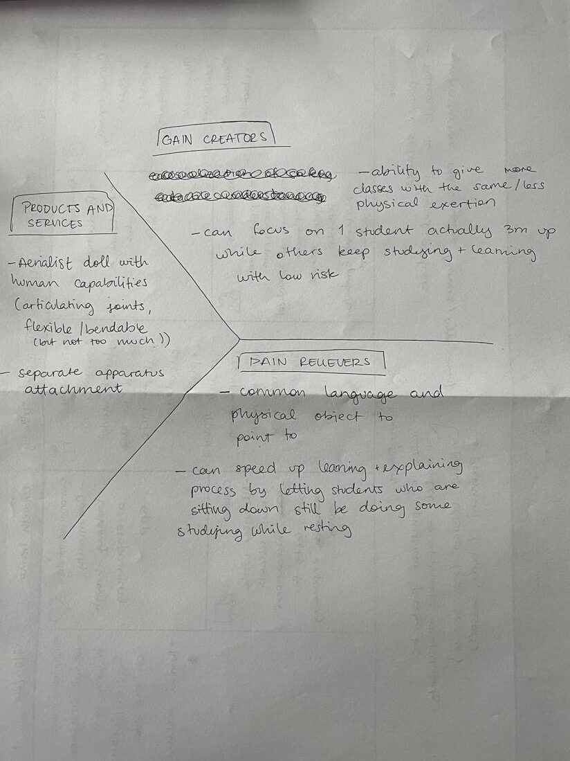 What is the solution you are offering? How does it work? I am offering an aerial silks teaching kit including colorful sleeves and a physical 3D model of a human, which has articulating joints and an additional apparatus add-on (starting with aerial silks). This model would have the possibility of demonstrating aerial silks figures on a smaller scale and with lower stakes. Plus, a premium model would have digital capabilities, with sensors embedded in the sleeves to track the person’s movements and be able to represent it autonomously in the model. This kit would also come with an accompanying app that will function as a personal digital aerial diary to log and track your own progress and create community.