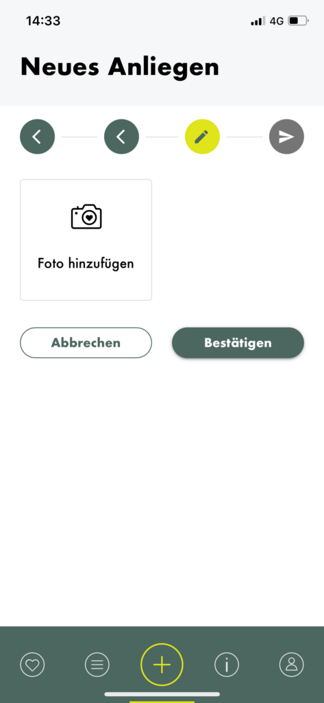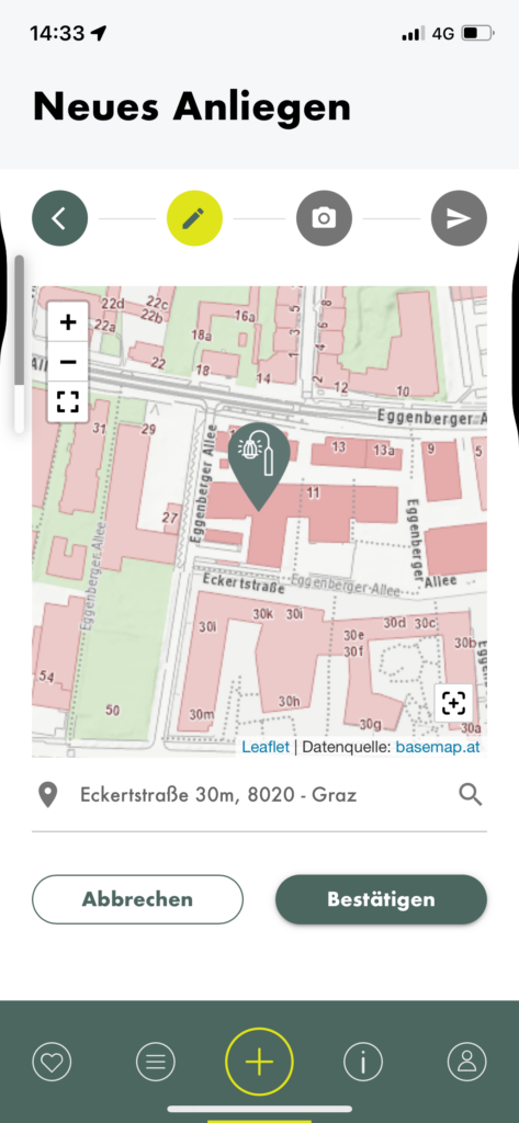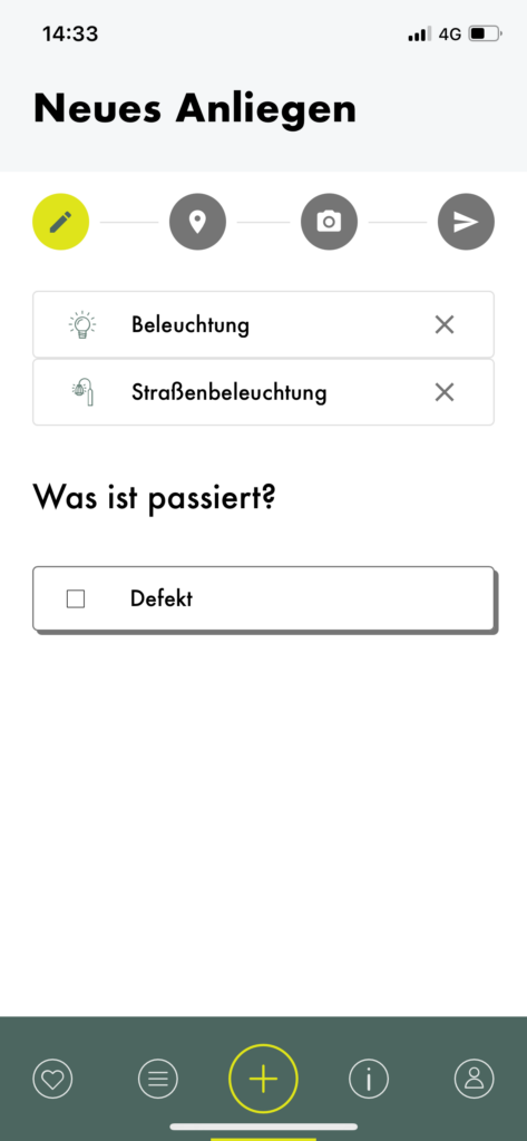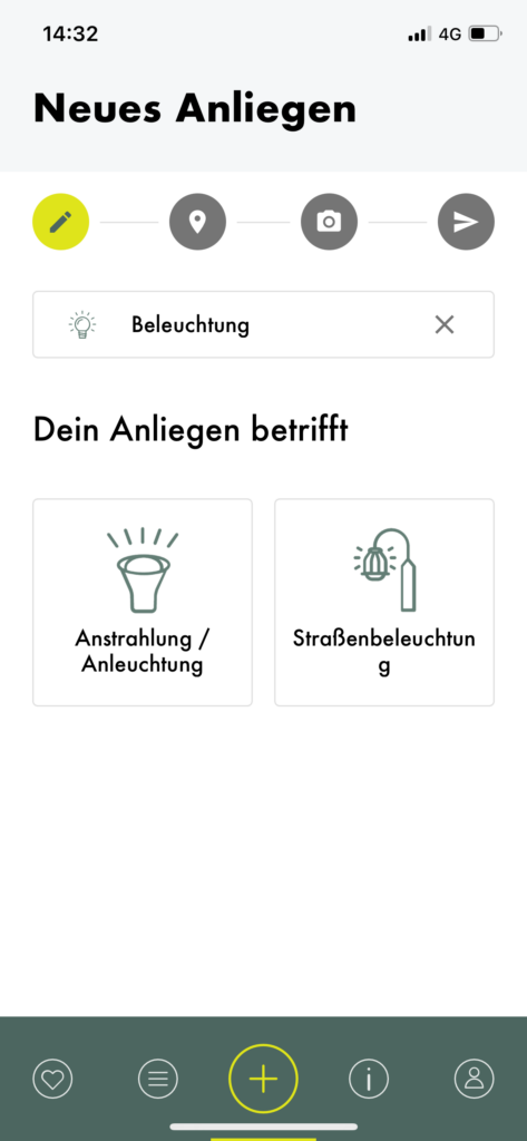When creating a new concern, you can choose from various categories, one of which is “Beleuchtung” (lighting). I tapped on it and was then asked to choose what kind of lighting I wanted to report. I was confused about the difference between the two options, but a quick google search and a closer look at the icons made me realise that the option on the left regards lights that illuminate façades and the other one concerns lampposts, which illuminate the streets. After selecting one, I was asked to choose what I wanted to report, and “fault” was the only option to choose from. A status bar and some sort of breadcrumbs menu allows you to track the progress and go back if needed. The second step is choosing the location of the fault, then you are asked to submit a picture. After that the report is ready to be sent.