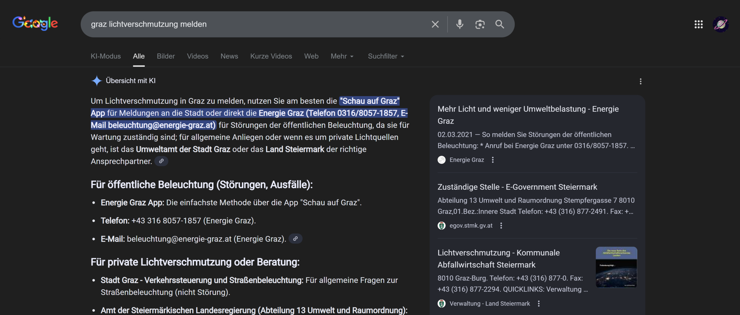 This week I researched ways to report faults in public lighting in Graz. First I used Google’s AI overview and then checked the information on various websites. The AI overview already gives a complete answer to the question: you can either contact Energie Graz, which manages the public lights in the city, or use the app Schau auf Graz (“look after Graz”).